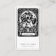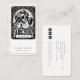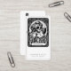 Una tarjeta de visita única para un artista de maquillaje con un esqueleto aplicando maquillaje, con el lema "belleza eterna". Un estilo único y con un toque de humor. Los medios sociales en la espalda.