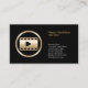 Esta sencilla tarjeta de presentación del editor de vídeo incluye un fondo negro de chorro con un icono de banda de vídeo dorado en el lado izquierdo de la tarjeta, mientras que su nombre, título y detalles de contacto aparecen a la derecha. Diseñado para cámara, fotografía, fotógrafo, imagen, imagen, diseño gráfico, video, cine, temas de artes creativas.