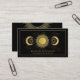Una tarjeta de visita para instructores de yoga etéreo celestial con una Mandala moderna dorada con rayos solares, y fases de la luna, con un tipo de bonito, escritura moderna.