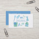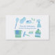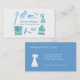 Una moderna y profesional tarjeta de visita con ilustraciones que rodean el nombre de la empresa. Incluyen artículos de limpieza como guantes, detergente, botellas de pulverización, cepillo de inodoro, cepillo de lavado, papel y tela, chiringuito, plancha y estriberas. Paleta de colores azul y verde que comunica un sentido de frescura y limpieza. Perfecto para los clientes de los servicios de limpieza de la casa! Personalice fácilmente los detalles de su empresa en las plantillas de texto proporcionadas.
