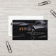 Esta tarjeta de negocios mecánica de temática oscura presenta un perfil de lado oscuro de un auto negro brillante. Su nombre comercial y el texto/eslogan aparecen dentro de una franja de panel de texto negro que se ejecuta desde el icono de la izquierda hacia el borde derecho de la tarjeta. Los datos de contacto aparecen en la parte inferior izquierda de la parte posterior de la tarjeta. Diseñado para los temas de automóvil, automoción, transporte, mecánica.