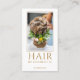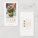 Una moderna tarjeta de negocios de peluquería glamorosa con tipografía de oro, para personalizar con tu especialidad e información. Esta foto muestra el estilo de un boda u otro evento formal. Reemplace esta muestra con su propia foto de pelo. También hay un eslogan opcional en el reverso de la tarjeta. Puede usarlo o eliminarlo. Añade tu propia foto estilista. Disponible en papel, como descarga digital, o ambos!