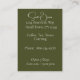 Esta tarjeta de visita tiene un diseño vintage de un tallo de frijol de café. Colores ricos de color burganeso y verde oliva sobre un fondo blanco. La parte trasera está decorada con un fondo verde oliva. He incluido plantillas en la parte delantera y trasera para su propia información y personalización. Hay varias opciones de papel disponibles, asegúrese de comparar el espesor y el brillo que serían adecuados para su negocio. Todos los artículos son rellenados por Zazzle y están garantizados un 100% de satisfacción. Para sus pedidos y problemas de envío, póngase en contacto con el Servicio de Atención al Cliente de Zazzle a través de https://goo.gl/nCgptf