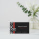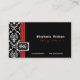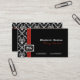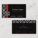 Tarjeta de presentación para damascos de diseño blanco negro. Hay una franja roja de arriba a abajo de la tarjeta y un rectángulo con tu monograma. Personalízalo con tu texto.