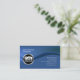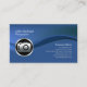 Esta sencilla y elegante tarjeta de visita para fotógrafos profesionales presenta un fondo azul. Una onda de matiz azul fluye de izquierda a derecha, dividiendo la tarjeta en dos secciones. Un icono circular de cámara cromada se sitúa en esta onda, en el lado izquierdo de la tarjeta, mientras que su nombre y título aparecen en la parte superior izquierda y su nombre de negocio y detalles de contacto aparecen en la parte inferior derecha. Diseñado para cámara, fotografía, fotógrafo, imagen digital, edición digital, temas de cine.