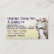 Tarjetas de visita con un tema agrícola. Una oveja y una pequeña imagen de cordero está en el lado derecho de las cartas con todo el texto alineado a la izquierda. Se puede utilizar texto impreso más grande, en color morado oscuro, para el nombre de la granja, el nombre de la empresa o el nombre personal. Se puede utilizar texto más pequeño para servicios, ubicación e información de contacto. Las imágenes de fondo son de una granja y oveja.