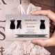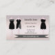 Carta de negocios moderna con ejemplos de vestidos con un fondo gris rosado de moda. Puede arrastrar o eliminar los ejemplos y también puede eliminar la imagen de etiqueta si no la necesita. Para todas las opciones, elija "personalizar". Hermosa tarjeta de visita para cualquier persona en la industria de la moda, así como para clases de costura o costurera.