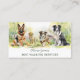 Una tarjeta de visita para el cuidado de mascotas caninas. Perfecto para paseantes de perros, niñera de mascota, pensión para perros o guardería para perros. En un fondo blanco, las imágenes acuáticas de cuatro perros, incluido un pastor alemán, labrador y un collie fronterizo, están rodeadas de bosque y vegetación. Personalice agregando los detalles de su negocio y contacto al principio y al final.