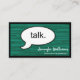 Estas simples tarjetas profesionales Verde azuladas "Talk" modernas de negocios son una elección de tarjeta de visita única y genial para un psicólogo, psiquiatra, consejero o cualquier otro negocio centrado en hablar o en la terapia. Esta carta es realmente atractiva; hay que notar y recordar.