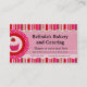 Tarjeta de negocios de horneado o de catering con caramelos de rayas rosas y verdes brillantes y motivos de quequitos. Texto editable todo formateado y listo para su personalizar en el sencillo editor de texto Zazzle. Creado con gráficos (c) de color.