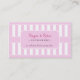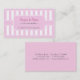 Una tarjeta de visita que evoca imágenes de un bistrot o de una pastelería francesa. Ideal para una tienda, una boutique, una cafetería o cualquier establecimiento comercial. La barra vertical rosa pastel desplaza el panel que contiene la información personalizada.Cambie el color de las franjas a uno de los cinco colores. Añada su información de contacto completa en la parte posterior. Disponible en colores alternativos con productos coincidentes.