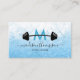 Modernas tarjetas de negocios de fitness con fondo azul de mármol y purpurina, una silueta de pesas barbacoas, un guión distintivo y una plantilla de texto profesional que es fácil de personalizar. Esto sería perfecto para un entrenador personal que trabaja en un gimnasio, o para un entrenador de salud autónomo.