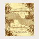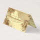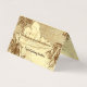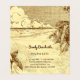 Tarjetas de presentación dobladas con letra script retro editable y letras mayúsculas sobre un grabado vintage tropical de palmeras en una playa de arena y hermosas nubes sobre olas tranquilas del océano en marrones, sobre un fondo de pergamino falso.