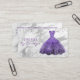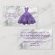 Elegante vestimenta costurera tarjeta de negocios, con gráficos de un vestido purpurina morado, contra un fondo de mármol plateado y blanco, con falsos toques de diamante. Personalice el texto para adaptarlo a sus necesidades empresariales. Una preciosa tarjeta para tu negocio de sastrería.