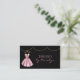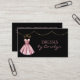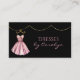 Glamorosa indumentaria costurera tarjeta de visita, con gráficos de un traje de baile estilo cóctel rosado, contra un fondo negro, con acentos dorados purpurinas. Personalice el texto para adaptarlo a sus necesidades empresariales. Una preciosa tarjeta para tu negocio de sastrería.