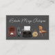 Tarjetas de visita para comerciantes de antigüedades en una plantilla editable con radio antigua, micrófono, silla, reloj y máquina de escribir en segundo plano con dos caras de impresión incluidas en este diseño único que puede personalizar en línea. Diseñado para todo aquel que compre, venda y evalúe antigüedades o que trabaje como Decorador de Casa o Diseñador de Interior.