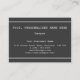 Este diseño sencillo y profesional de tarjetas de visita incluye un nombre y apellido, un nombre de empresa, un título profesional e información de contacto que son personalizables. También cuenta con un borde blanco de doble línea. Tarjetas de visita como estas pueden ser utilizadas por un profesional como un abogado o un abogado.
