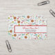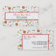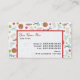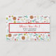 Tarjetas de visita con un patrón temático de artes y artesanías. El diseño consiste en una bola de hilo con agujas de punto, botones, tijeras, una botella de purpurina, una botella de pegamento, cinta de correr y una pistola de pegamento caliente. El diseño tiene un estilo retro naranja, amarillo, rojo y azul/turquesa.