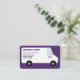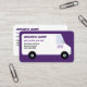 Un simple dibujo de una furgoneta de reparto está en la parte delantera de la tarjeta. Su nombre comercial, lema de la empresa, nombre, título y número de teléfono se imprimen en el panel lateral de la furgoneta comercial como si estuviera pintada allí. La furgoneta es blanca con letras violetas. La furgoneta está dibujada en un estilo minimalista, casi personalizado. Detrás de la furgoneta hay un sólido fondo morado oscuro que va con las letras púrpura. La parte posterior tiene información de contacto adicional. Bien para los siguientes tipos de negocios: transporte por carretera, envío, logística, traslado, transporte y cualquier otro negocio que utilice una camioneta grande. La tarjeta también puede utilizarse para servicios móviles como limpieza, conserjería, camiones de comida, artesanos, fontaneros, electricistas, carpinteros, pintores, instalaciones domésticas, servicios de salud domiciliaria, HVAC, etc.