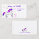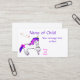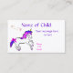 Las ilustraciones gráficas caprichosas de un unicornio colorido y de un perno de seguridad lindo se pegaron en la tarjeta. El texto está en púrpura y rosado hacer juego las ilustraciones. Maravillosamente tarjeta de visita de la diversión para cualquier niño.