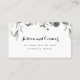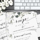 Una sutil invitación a una boda blanca con una acuarela pintada delicadamente de flores de peonía blancas y vegetación eucaliptus con un dúo de letras de caligrafía con chispas negras para este RSVP en línea.