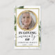 Tarjeta de oración totalmente personalizada con una cruz decorativa en la parte trasera y versos de oración que se pueden personalizar. La tarjeta de oración viene con un personalizable y una foto personalizada y con un nombre personalizado y fecha del funeral. El diseño presenta un estilo de escritura a mano/caligrafía junto con fuentes elegantes y elegantes.