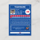 La parte posterior de la tarjeta tiene un fondo azul, con un poco de rojo también. El texto y los contornos de cuadro rectangulares son blancos.