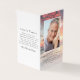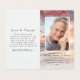 Nuestras pequeñas tarjetas de oración conmemorativas miden 2" x 3,5" cuando se doblan. Este diseño tiene espacio para una foto de tu ser querido en el frente con su nombre y fechas. Dentro puedes añadir otra fotografía y un verso corto o una oración. En la parte de atrás, puede agregar palabras de agradecimiento. Tenga en cuenta que esta tarjeta no puede ser laminada. Tenemos una variedad de tarjetas planas de plegarias laminadas disponibles en nuestra tienda.