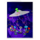 Los empujes extranjeros verdes de la cabeza fuera de la nave espacial y de un campo de setas aflojadas poder en muchos colores con los corazones que brillan intensamente crecen debajo de él.