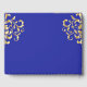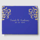 Un rico y elegante libro de invitados de bodas con damasco dorado y azul real. Este libro de bodas es parte de un juego de invitaciones a la boda.