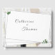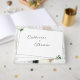 El diseño del libro de Bodas White Lace y Rosa Leaves incluye los nombres de las novias y novios en la portada con letras de plata decorativas. El fondo muestra la imagen de encaje blanco. Las hojas de rosa verdes se colocan delicadamente en las esquinas. El reverso muestra la imagen de fondo de una novia y un novio rodeados por la imagen de encaje blanco.