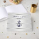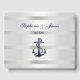 Elegante Ancla azul de la Marina Náutica, Silvery White Background Guest Book Limpio, elegante, moda y elegantes accesorios de fiesta de personalizable con un fondo blanco con rayas gradientes plateadas y un ancla azul marino central. Tenga en cuenta que se trata de un diseño gráfico / foto que se transfiere al producto subyacente, y que no contiene telas, cintas, metales, grabado, gemas o emboscamientos reales. 2013 ©itsMyPartyDesigns Todos los derechos reservados