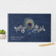 azul moda sobre el cartel azul de invitado de boda damasco en el libro. En la parte delantera del libro encontrarás una gráfica de una lujosa plata y perla, con una pluma de pavo real y un arco de satén azul que adornan el medio. Personalice el texto para su día especial.