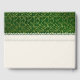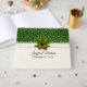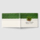 Libro de invitados temático sobre la boda de invierno realizado en un marfil antiguo con gráficos de un patrón verde y dorado en la parte superior y una cinta de encaje de marfil en el medio. Gráficos de un alfiler de pino con conos de pino, decoran el frente medio. Personalice los campos de texto para su día especial. Hay productos bodas que coinciden.