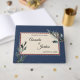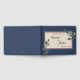 Este libro de bodas Pine Blue Winter combina una elegante y formal frontera con marcos azules polvorientos con elegantes ramos de pino verde que le dan un toque clásico y rústico. El follaje de vegetación botánica con caligrafía sobre un fondo beige crea una atmósfera enfocada a la naturaleza para una celebración matrimonial de Navidades o destino forestal.