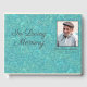 Añade una foto favorita de tu ser querido, junto con el nombre completo y fechas de vida, a este hermoso libro de invitados "In Loving Memory". El fondo tiene el aspecto de lujoso cuero grabado en relieve en un magnífico color verde azulado/turquesa con el texto todo en gris profundo. La parte frontal tiene un elegante tipo de letra de guión, mientras que una fuente sans serif crujiente fue seleccionada para la columna para que pudiera ser fácilmente legible en el estante.