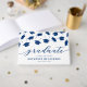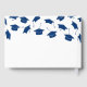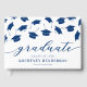 Libro de invitados moderno para fiestas de graduación con un sencillo fondo blanco que se puede cambiar a cualquier color, gorras de mortero azul cayendo y una plantilla de texto moderna que es fácil de personalizar.