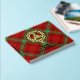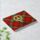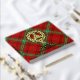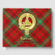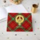 Insignia escudo del clan Morrison rodeada por una correa y hebilla sobre fondo escocés rojo. texto frontal, espalda y columna vertebral personalizado.
