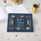 Mauve y Navy Blue Gold Plum Boda Guest Book - con vegetación (eucalipto) sobre un fondo acuático azul marino con elementos florales en tonos violeta, ciruela, malva, rosa polvoriento y burdeos profundos.