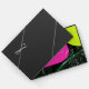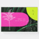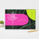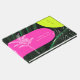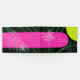 Arcos de color rosa y amarillo neón sobre fondo de hojas de palma oscuras con monograma, nombre y fecha, y ilustraciones de dibujo de hojas de palma blancas.
