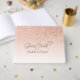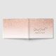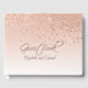 El encantador libro de bodas está hecho en un fondo oscuro y rubio, con gráficos de un rosa purpurina de aspecto dorado. Rosa de texto gráfico de oro dice Libro de invitados. Personaliza los nombres de la novia y del novio, para tu día especial.