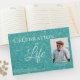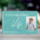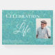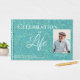 Este hermoso libro de invitados Celebration of Life incluye una cubierta verde azulada o turquesa con un aspecto de cuero grabado en relieve. El texto se encuentra en la coordinación de secuencias de comandos y tipos de letra serif en un matiz de letra casi verde azulado-blanco. La foto de tu ser querido será enmarcada en el mismo color pálido que el texto. Un marco estrecho encierra la foto; un marco más estrecho es decorativo justo dentro del marco exterior. Recuerde sustituir el nombre de su ser querido por la columna vertebral. Nuestras condolencias por su pérdida.