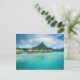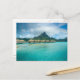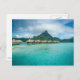 Postal de un lujoso complejo de bungalows con techo de paja en un complejo vacacional en la laguna azul claro con vistas a la isla tropical de Bora Bora, cerca de Tahití, en la Polinesia Francesa.