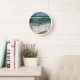 Este Wall Clock cuenta con un paisaje marino, con vistas al océano Atlántico desde la playa de Juno, Florida. Las olas están rodando en la arena, hasta nuestros pies, con un cielo azul encima, lleno de nubes blancas sucias.