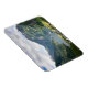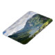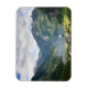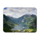 Imán rectangular de recuerdo del famoso fiordo Geirangerfjord, un crucero y la aldea de Geiranger entre las montañas de Noruega.