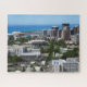 Rompecabezas. Una vista panorámica del centro de Honolulu Hawaii bajo un cielo azul claro muestra una mezcla de rascacielos altos y edificios más pequeños. A lo lejos, el océano azul y tranquilo se cruza con el horizonte, proporcionando un entorno tranquilo.
