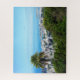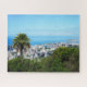 Rompecabezas. El Honolulu Hawaii ofrece vistas panorámicas a los edificios de las alturas, agrupados cerca de la orilla. En primer plano, sobre una colina verde y exuberante que domina la zona urbana y el océano azul que se extiende más allá, hay una palmera.