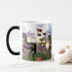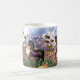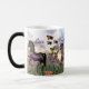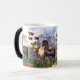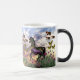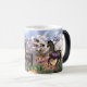 " VIVO, RISA, taza morphing del AMOR" tiene 3 caballos y pájaros brillantemente coloreados del carrusel que se divierten en una escena digital del prado.