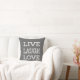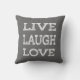 Las tres claves de una vida feliz...Viva todos los días al máximo, ríe mucho y ame incondicionalmente. Esta encantadora almohada de motivación tiene tres palabras inspiradoras: Live, Laugh y Love resaltados en un contexto gris castaño opuesto.