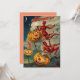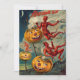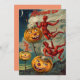 El humo nublando el cielo, los demonios pueden aludir a la humanidad. Esta Halloween vintage representa demonios voladores, humo, una linterna sonriente y luna creciente.
